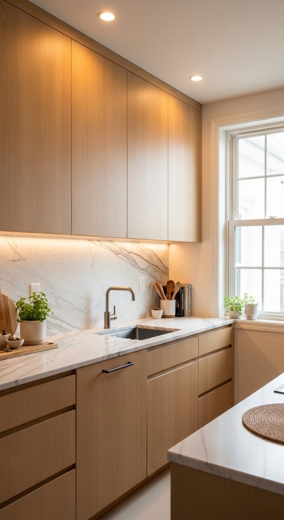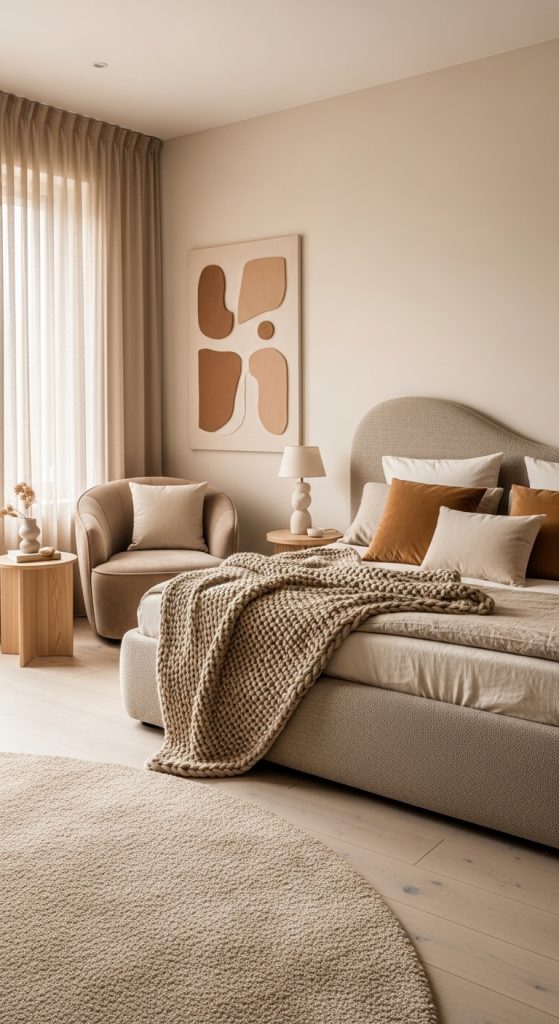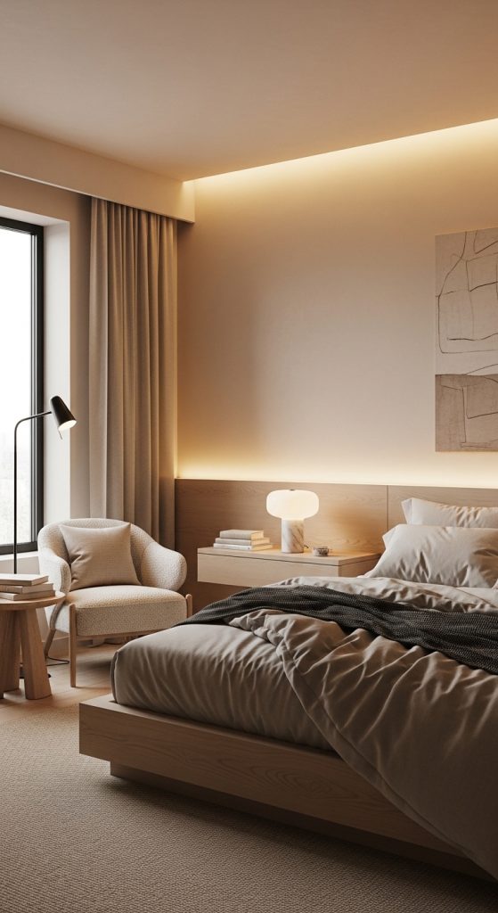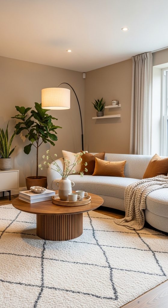 Modern interiors don’t have to feel cold. One of the most effective ways to achieve a cozy modern look is by using warm minimalism. Instead of stark whites and harsh grays, opt for soft beige, ivory, taupe, and warm sand tones.