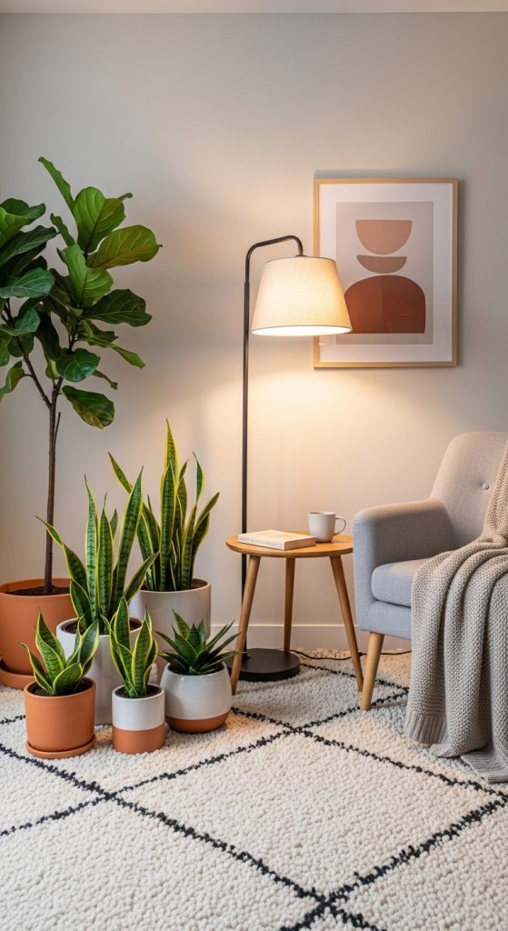 Consider large plants like fiddle leaf figs or monstera for corners, and smaller plants like succulents or pothos for shelves and tables. The natural shapes contrast beautifully with structured modern furniture.