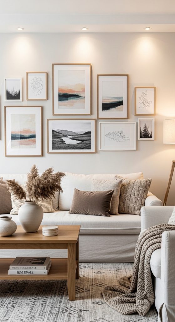 Mix framed prints with personal photos and abstract art in neutral or earthy tones. Keep frames consistent in color for a cohesive modern look while allowing the content to add emotional warmth.
