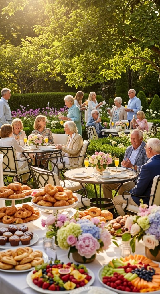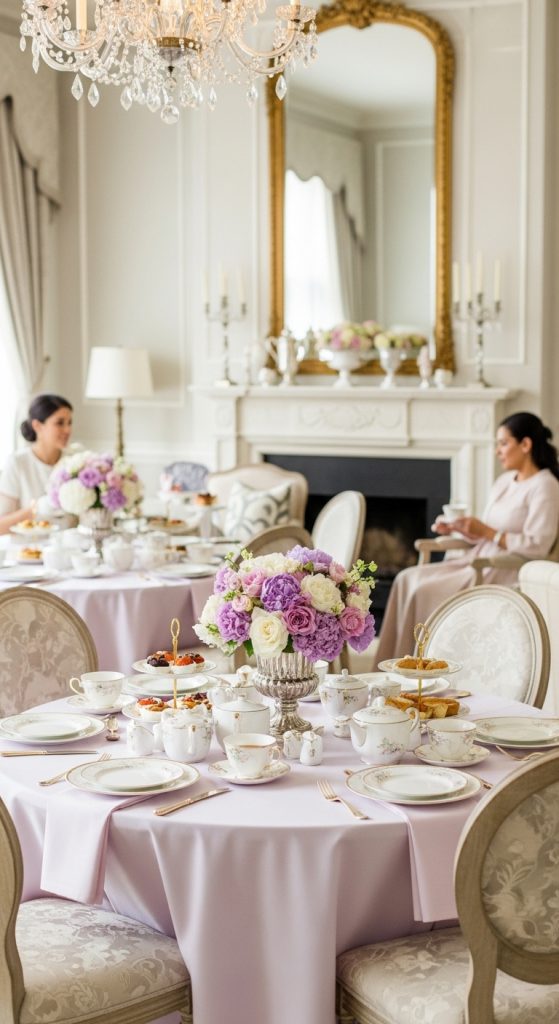 Decorate with floral arrangements, fine china, and pastel tones. Soft classical music or instrumental tracks can enhance the refined atmosphere. This idea is perfect for smaller, more sophisticated gatherings.