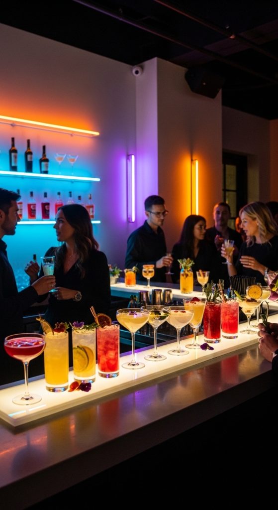 You can feature a few signature drinks like mojitos, sangria, or fruit-based mocktails. Add small bite-sized appetizers such as sliders, cheese platters, and finger foods. Dim lighting and soft music help create a lounge-like atmosphere.