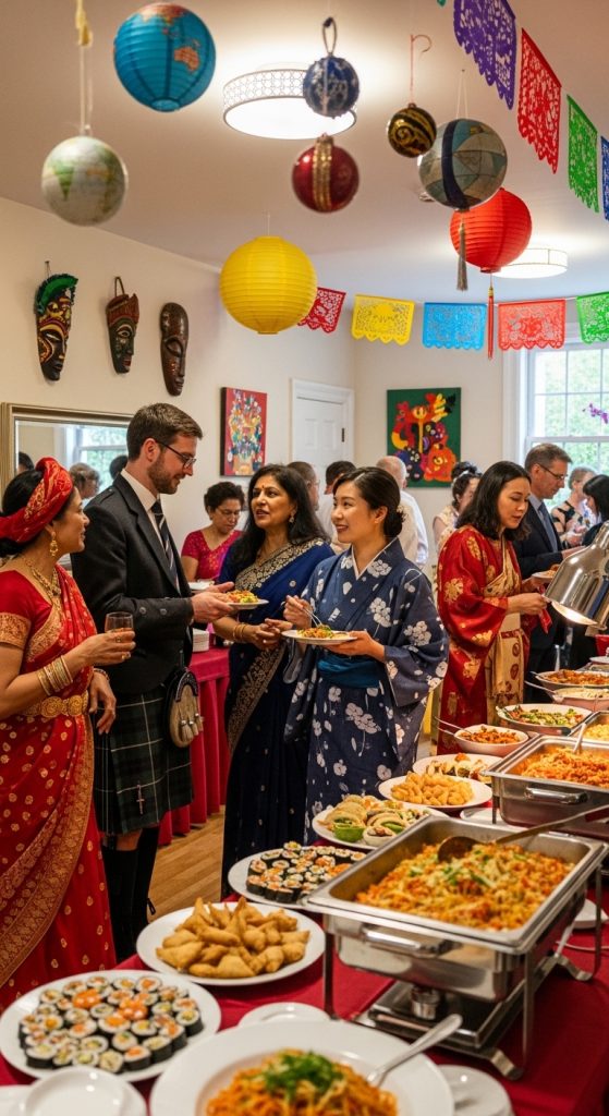 Serve a variety of global dishes such as Asian dumplings, Middle Eastern mezze, or Italian pasta bites. You can also include music or short performances representing different cultures.