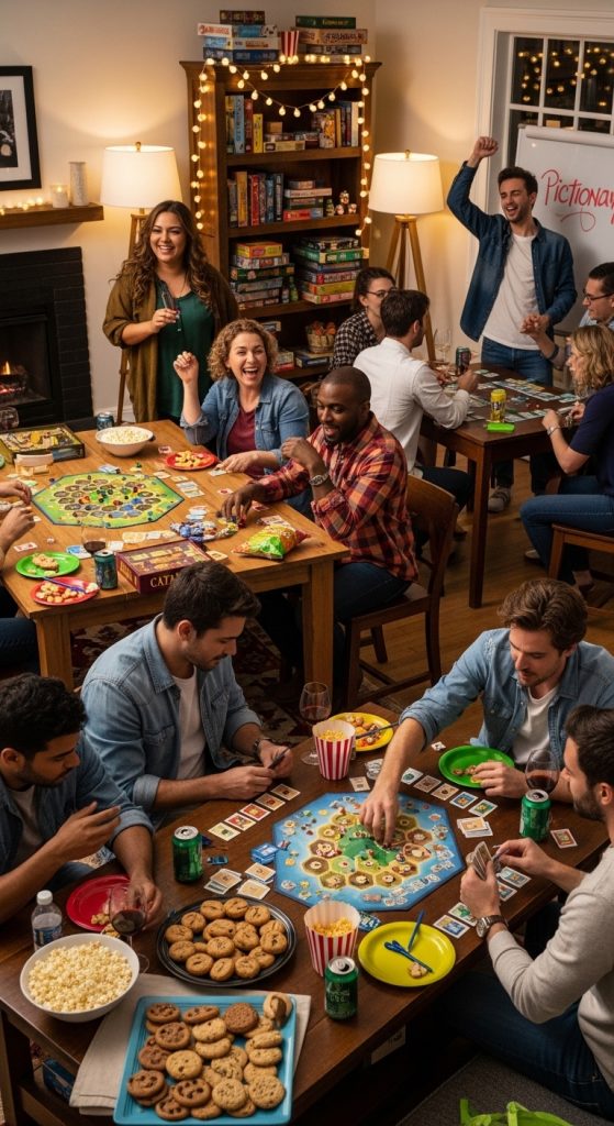Popular options include Monopoly, Uno, charades, or trivia games. Keep snacks easy to grab so guests can play comfortably without interruption. This setup guarantees laughter and friendly competition.