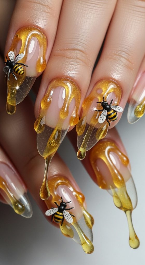 Honey drip nails are luxurious and artistic. A warm golden or amber base with a dripping honey effect creates a glossy, fluid look. Tiny bees can be added near the drips to complete the honey-inspired fantasy. This design is perfect for a rich, aesthetic manicure.