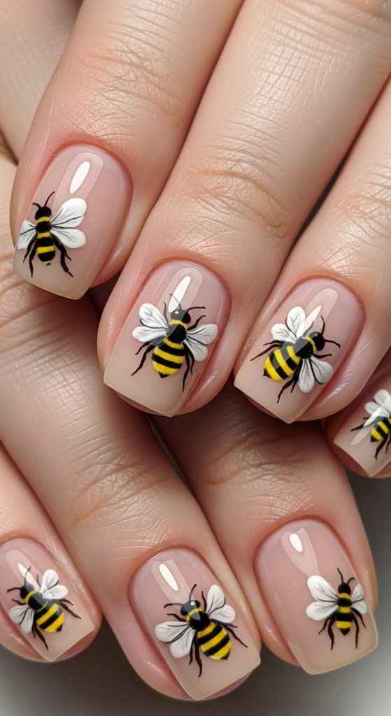 A simple yet timeless design features a soft nude or pastel base with one or two accent nails showcasing a tiny bee illustration. The bees are usually drawn in black and yellow with delicate wings. This design is perfect if you prefer subtle nail art that still makes a statement.