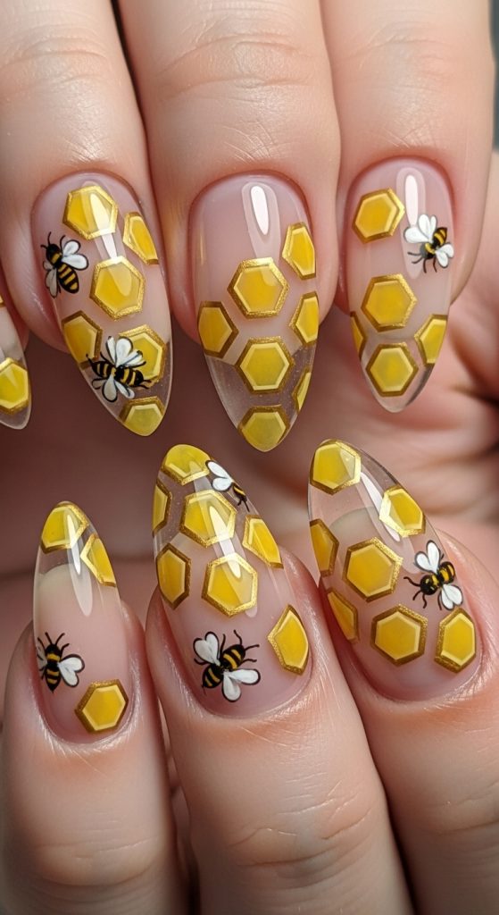 Honeycomb nails bring geometry and nature together. A golden-yellow honeycomb pattern over a transparent or nude base creates a chic, structured look. You can add tiny bees flying across a few nails to enhance the theme. This design feels modern and artistic while still playful.