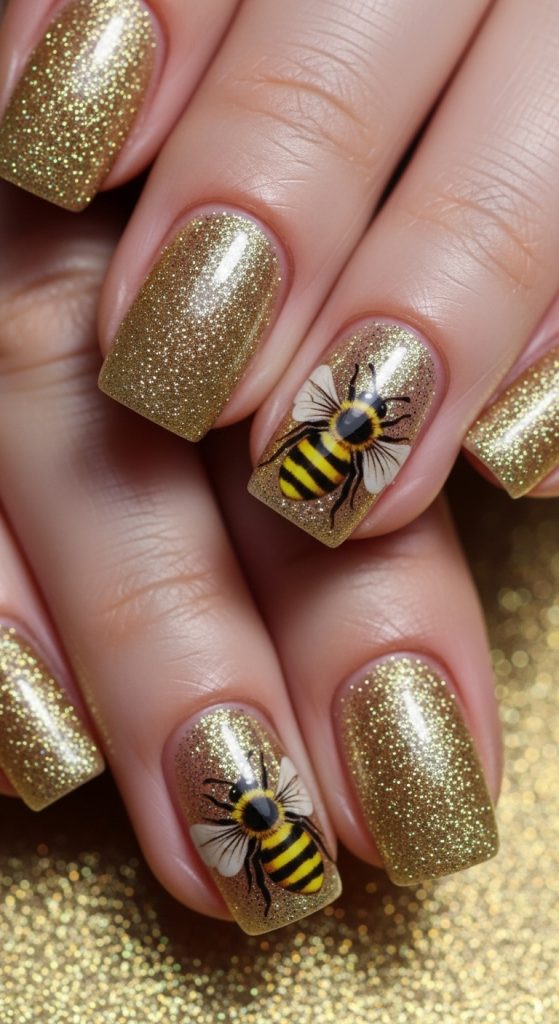 For those who love sparkle, glitter bee nails are a must-try. A shimmering gold or glitter base represents honey, while small bee decals or hand-painted bees add charm. This style is perfect for parties or festive occasions where you want your nails to shine bright like honey in sunlight.