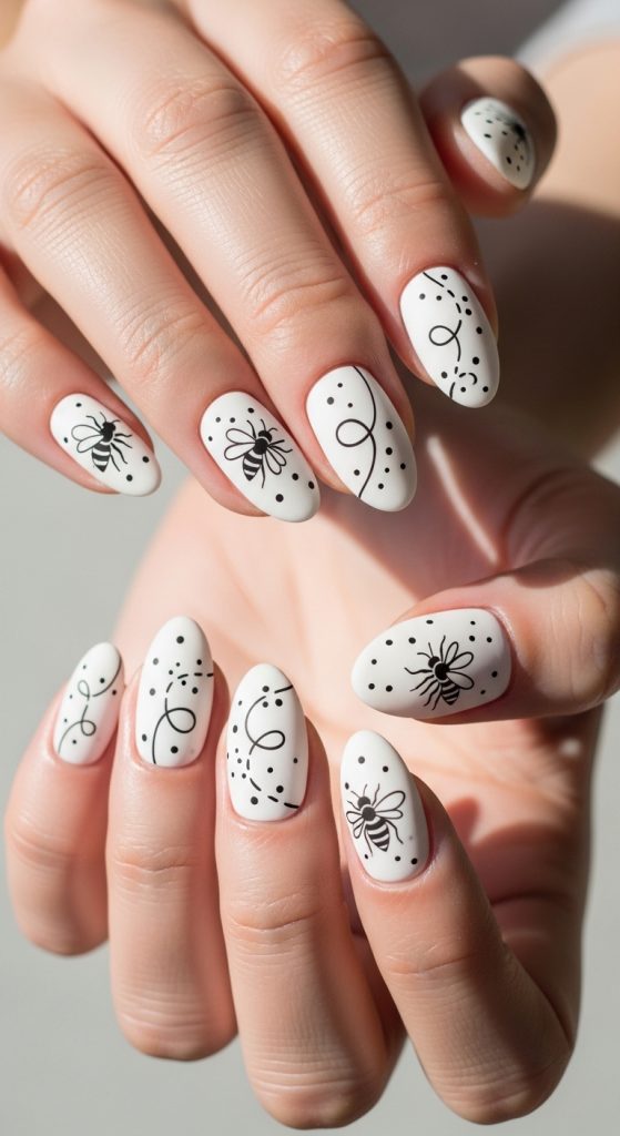 Minimalist nail art is all about simplicity. A white or pale pink base with fine black line art of bees creates an elegant and clean look. Some nails may feature just bee outlines, while others can have tiny dots representing pollen. This design is perfect for professionals who prefer understated beauty.