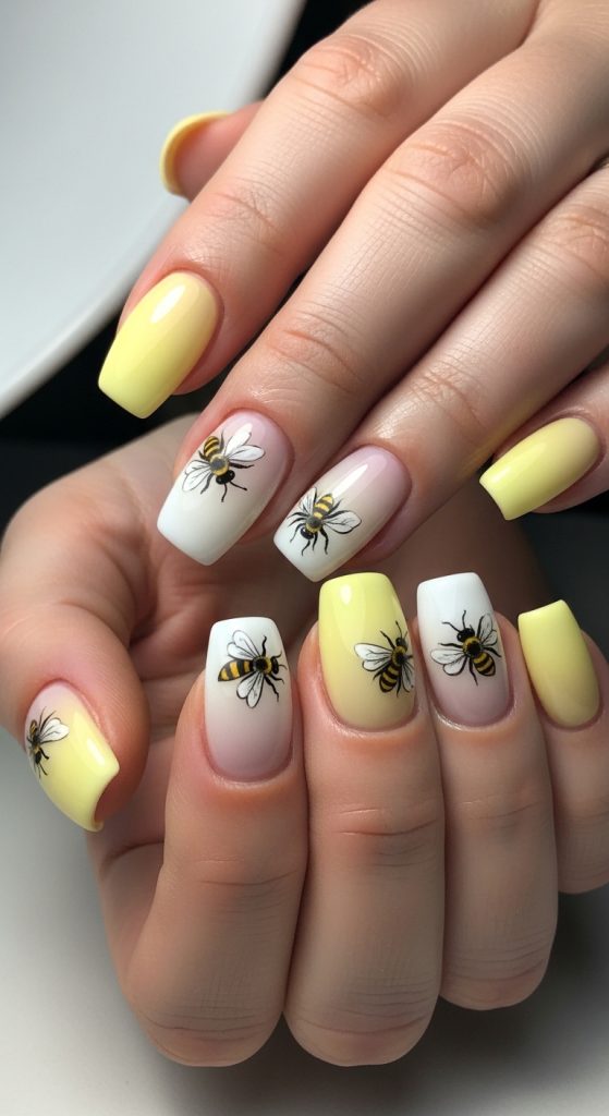 Ombre nails transitioning from soft yellow to white or nude create a smooth, sunny background for bee designs. Add tiny bees flying across the gradient for a lively effect. This design captures the essence of summer and feels fresh and cheerful.