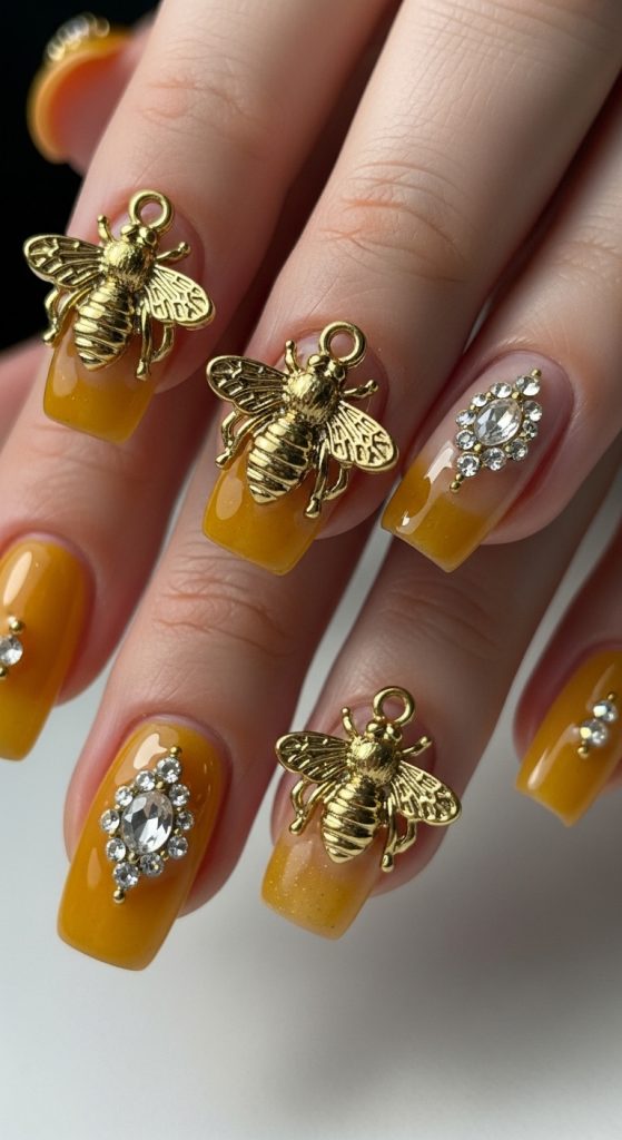 For a bold and trendy look, 3D bee nails are a standout choice. Small bee charms or raised designs are placed on acrylic or gel nails, often paired with rhinestones or honey-colored accents. This style is eye-catching and perfect for those who love dramatic nail art.