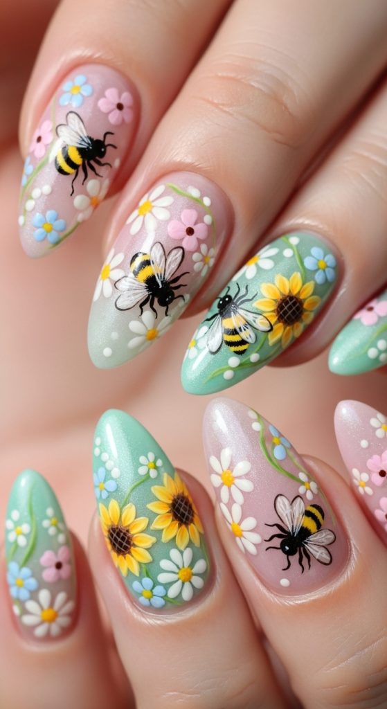 Combine bees with blooming flowers for a dreamy garden-inspired manicure. Soft florals like daisies, sunflowers, or wildflowers pair beautifully with tiny bees flying between petals. A pastel base enhances the soft, romantic vibe of this design.