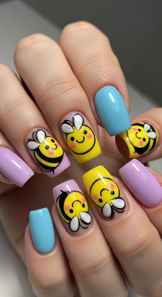 Cartoon-style bee nails are fun, playful, and full of personality. Bright yellow bees with cute smiling faces can be painted over colorful or pastel backgrounds. This design is especially popular for younger nail art lovers or anyone who enjoys whimsical styles.