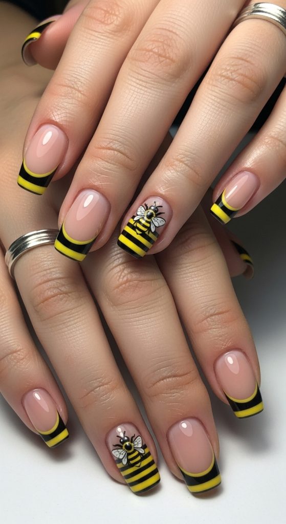 Give the classic French manicure a bee-inspired upgrade. Instead of plain white tips, use yellow and black stripes to mimic a bee pattern. Add a tiny bee on one or two nails for a subtle themed touch. This design blends elegance with creativity.