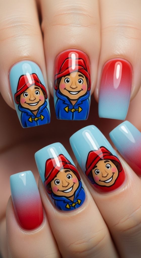 For fans who love detailed nail art, this design features mini portraits of Paddington on accent nails. The rest of the nails can be kept simple with blue and red gradients.