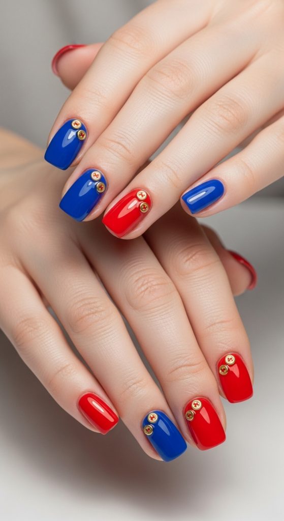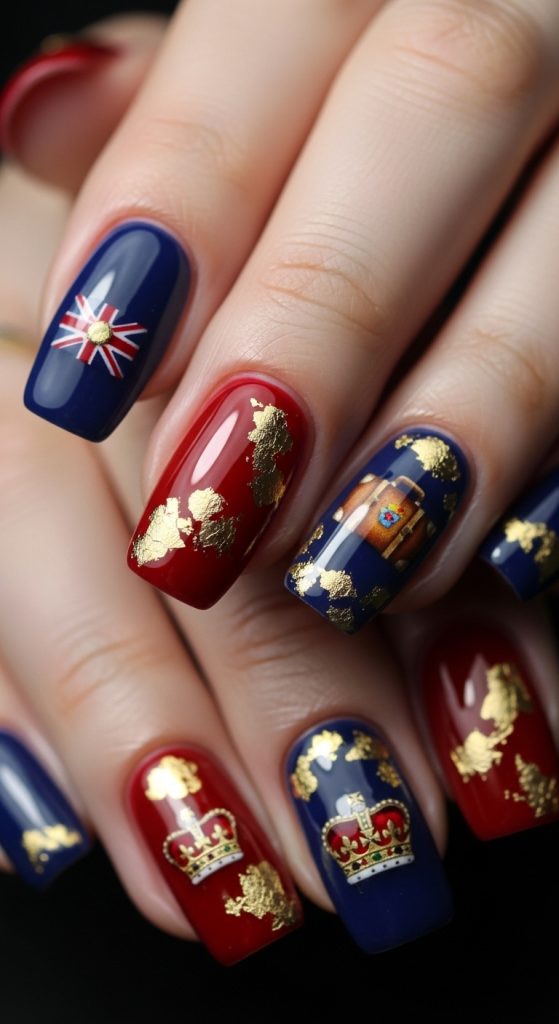 Gold foil accents represent Paddington’s charm, while alternating red and blue nails keep the design balanced. You can also add tiny crown or suitcase icons for a regal travel vibe.