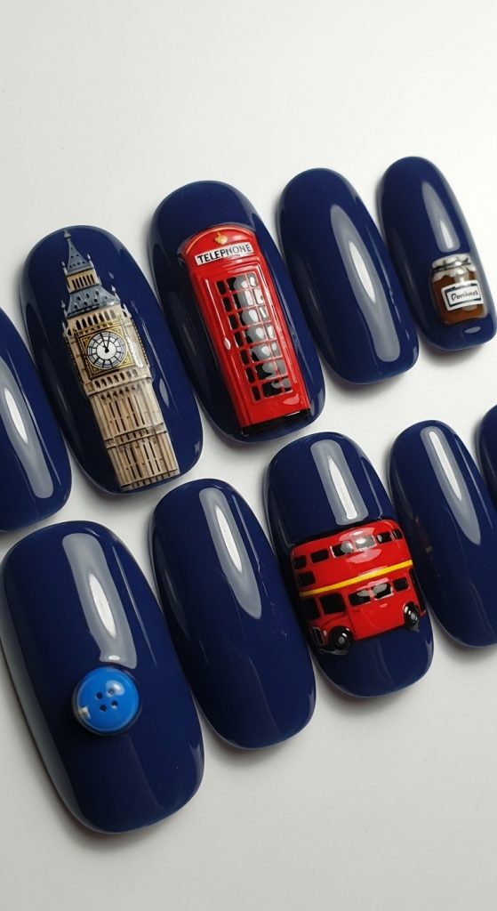 Each nail can feature a different landmark, making the set feel like a miniature London tour. This design is perfect for travelers or fans of British culture.