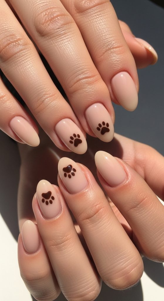 If you prefer subtle designs, this idea is ideal. Use a soft nude or beige base and add tiny brown bear paw prints on one or two nails per hand. The rest remain clean and glossy.