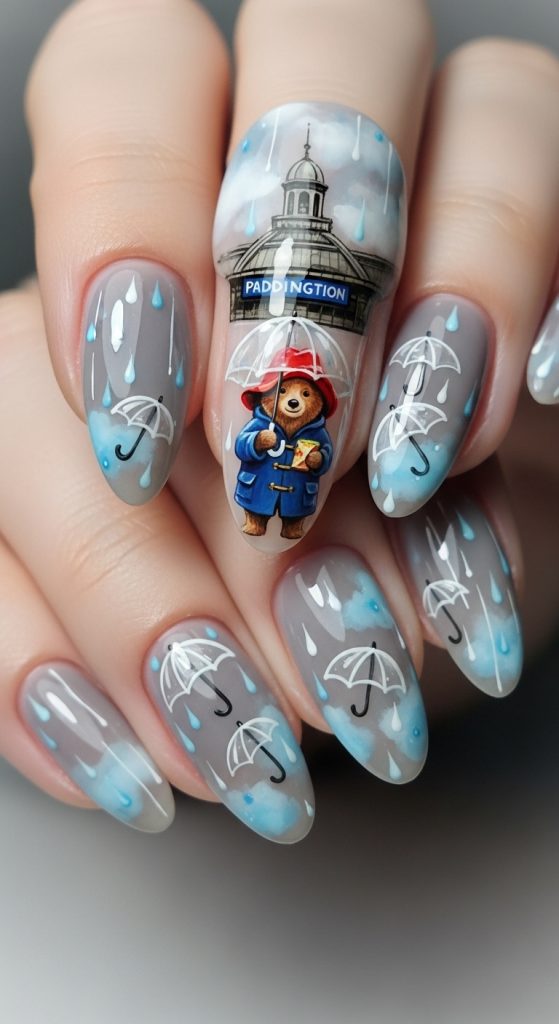 One nail can even feature a tiny illustration of Paddington holding an umbrella, making it feel like a storybook scene on your fingertips.
