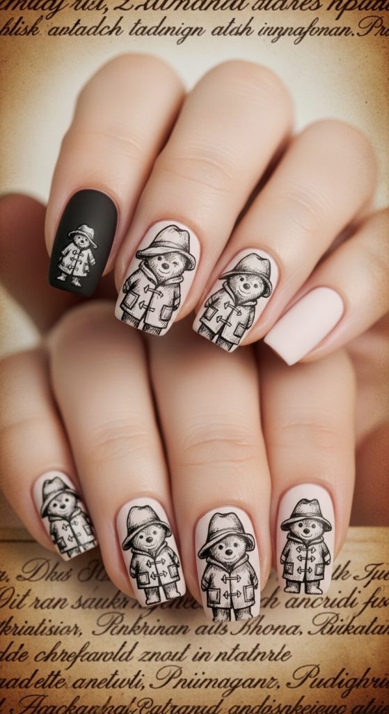 This design mimics old children’s book illustrations. Use soft sepia tones, muted browns, and hand-drawn sketch-style art. Each nail can feature a different scene: Paddington at the station, sipping tea, or exploring London streets.