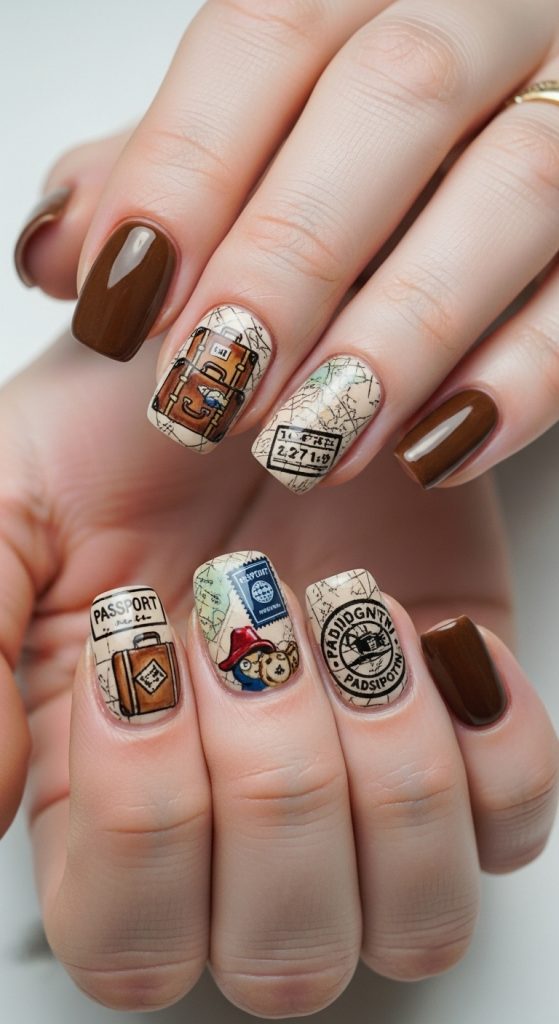 Paddington is famous for carrying his suitcase filled with essentials. This nail idea focuses on travel themes—tiny suitcase illustrations, passport stamps, and map-inspired patterns.