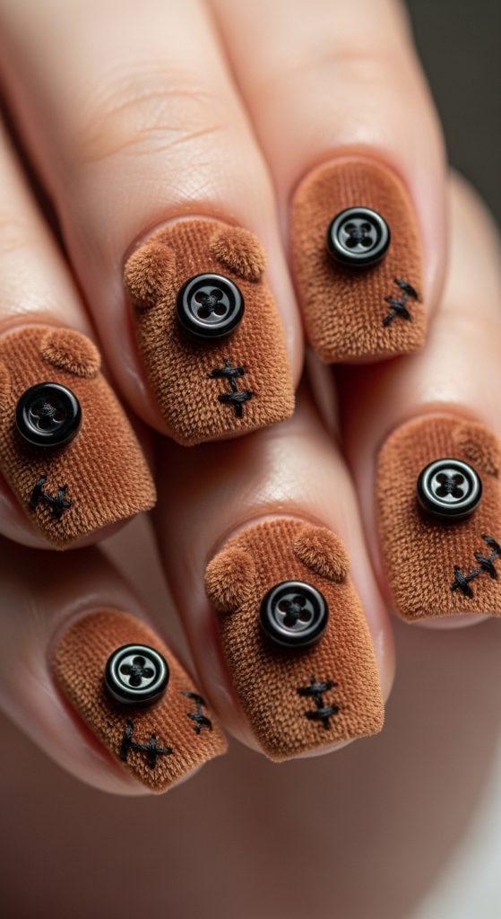 This cozy design mimics the texture of a teddy bear. Using matte brown polish, velvet nail powder, or 3D textured gel, the nails resemble soft fur.